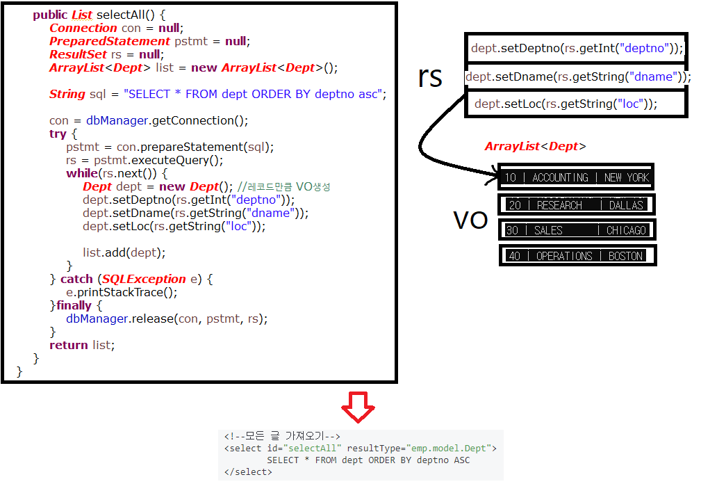 지금까지는 DAO의 코드 기술을 JDBC로 이용하였기 때문에 쿼리문보다 그 외의 코드가 더 장황했었다.