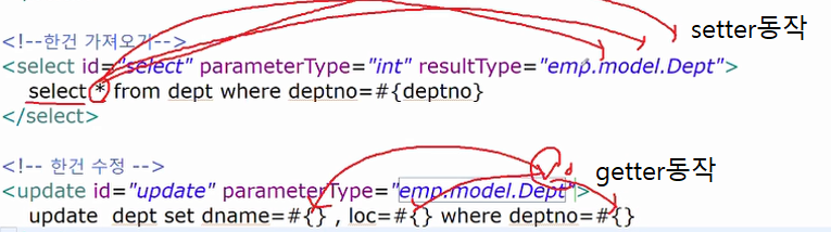 <select id="select" parameterType="int" resultType="emp.model.Dept">